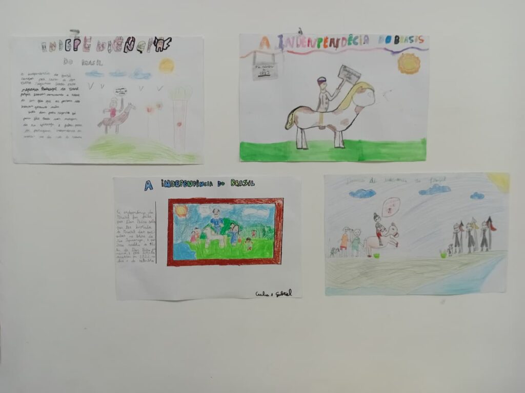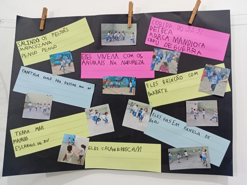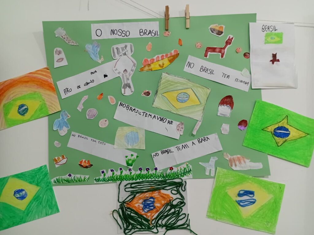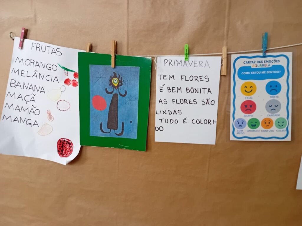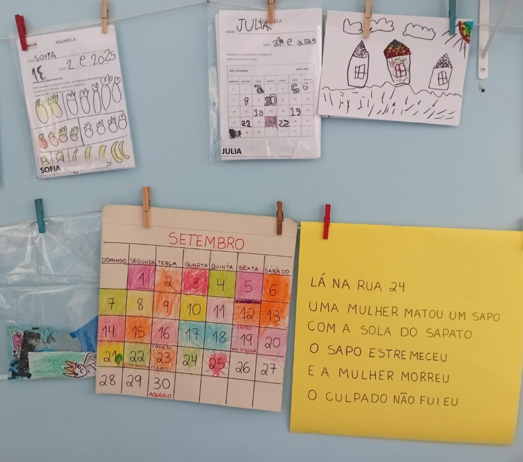 Não encontramos enfeites prontos ou comprados. O que se vê são marcas vivas do que acontece em nossas salas: desenhos, artes das crianças, produções coletivas que celebram as datas especiais, cartazes que revelam o que já sabemos, o que queremos descobrir e o que descobrimos ao longo das aprendizagens.